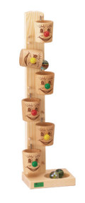 顔の描かれたカップが横になり玉を運び、落とします。