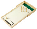 こまを回してピンを倒しますが、傾斜が付いているので思うようには進んでくれません。